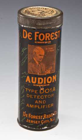Radio tubes were expensive in the 1920s and DeForest sold his in the orange and black metal cylindrical containers, c. 1924