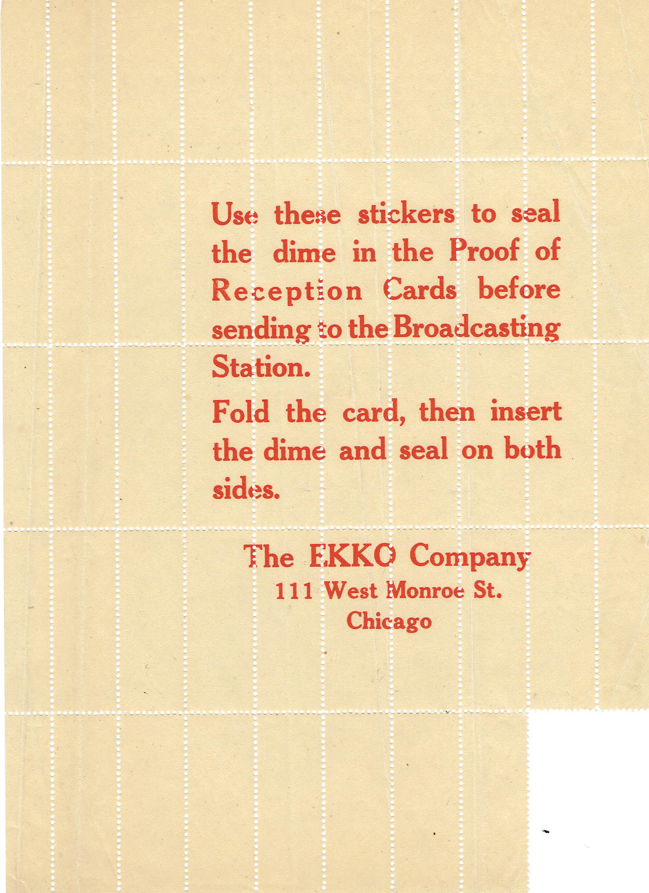 A page of two EKKO fold-over reception report postcards with a circular cutout to hold the dime. A sticker torn off the page on the right was used to seal the postcard once folded over and secure the dime in place.