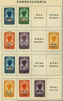 Home-made EKKO stamp album which a listener prepared in a photo album, c. 1927. Pages from the home-made stamp album. Missouri has one EKKO stamp. Some stations either made their own stamps or had elegant, foil stamps created like the KMOX stamp on this page.