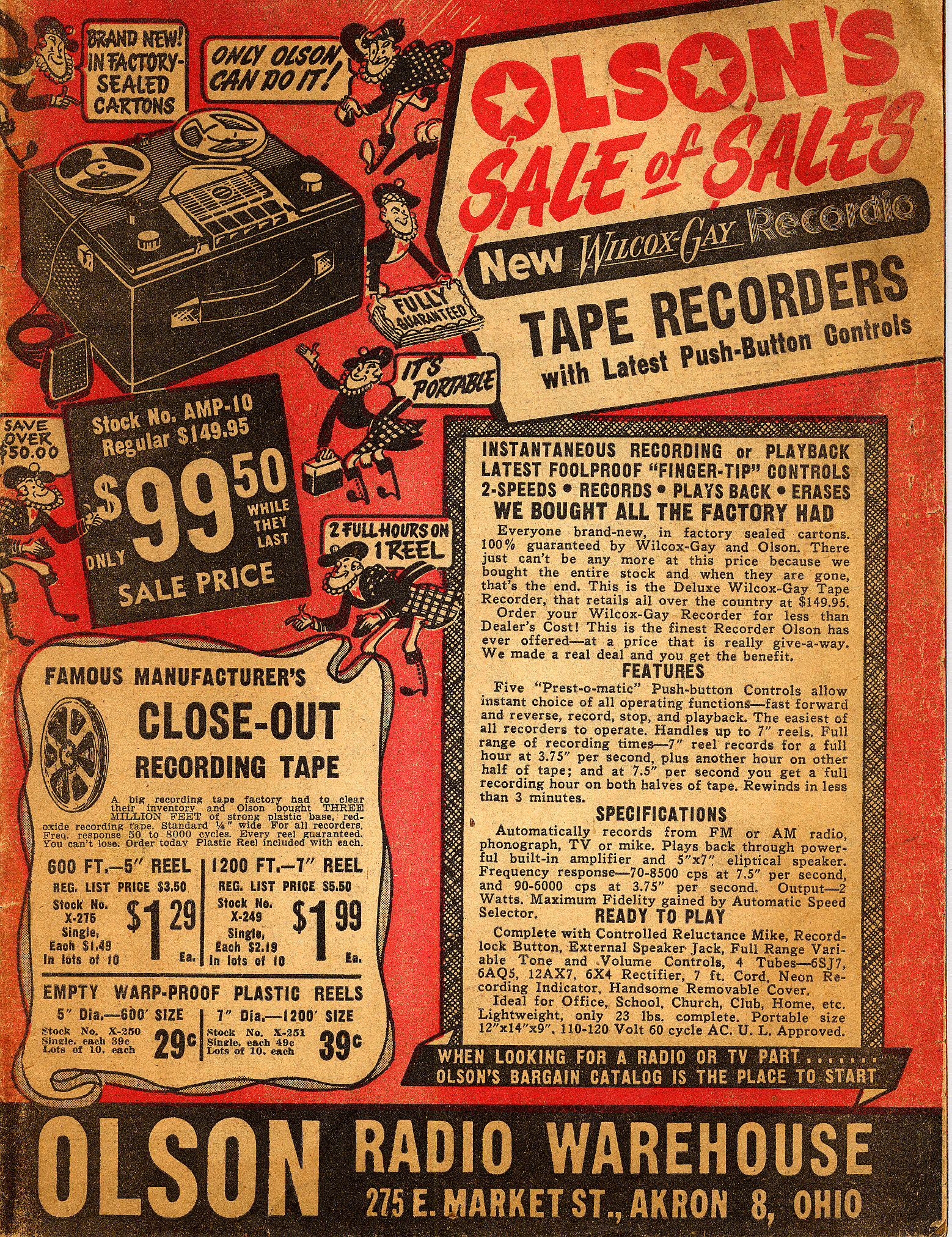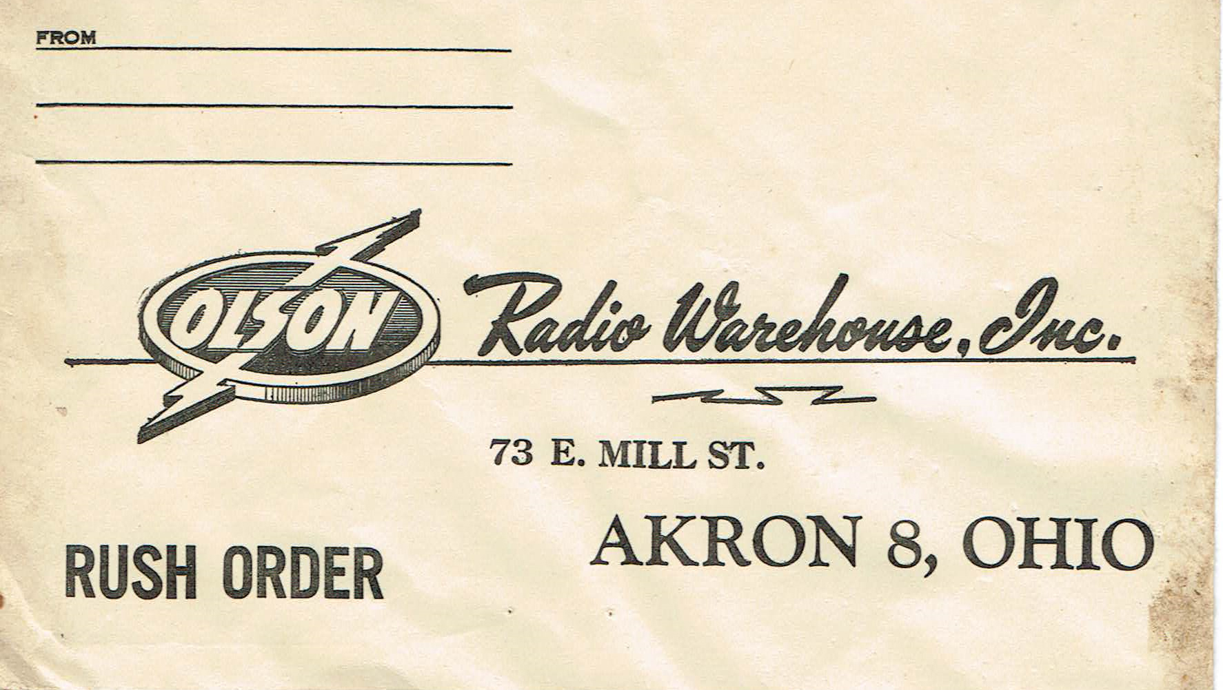 Olson Radio Warehouse was founded just after World War II by Irving Olson, headquartered in Akron, Ohio. It ultimately had stores in a number of states and was a major electronics mail-order outfit before it was acquired by Lafayette Radio (which was, in turn, later purchased by Allied Radio which was, itself, purchased by Radio Shack). The catalog is from the mid-1950s.