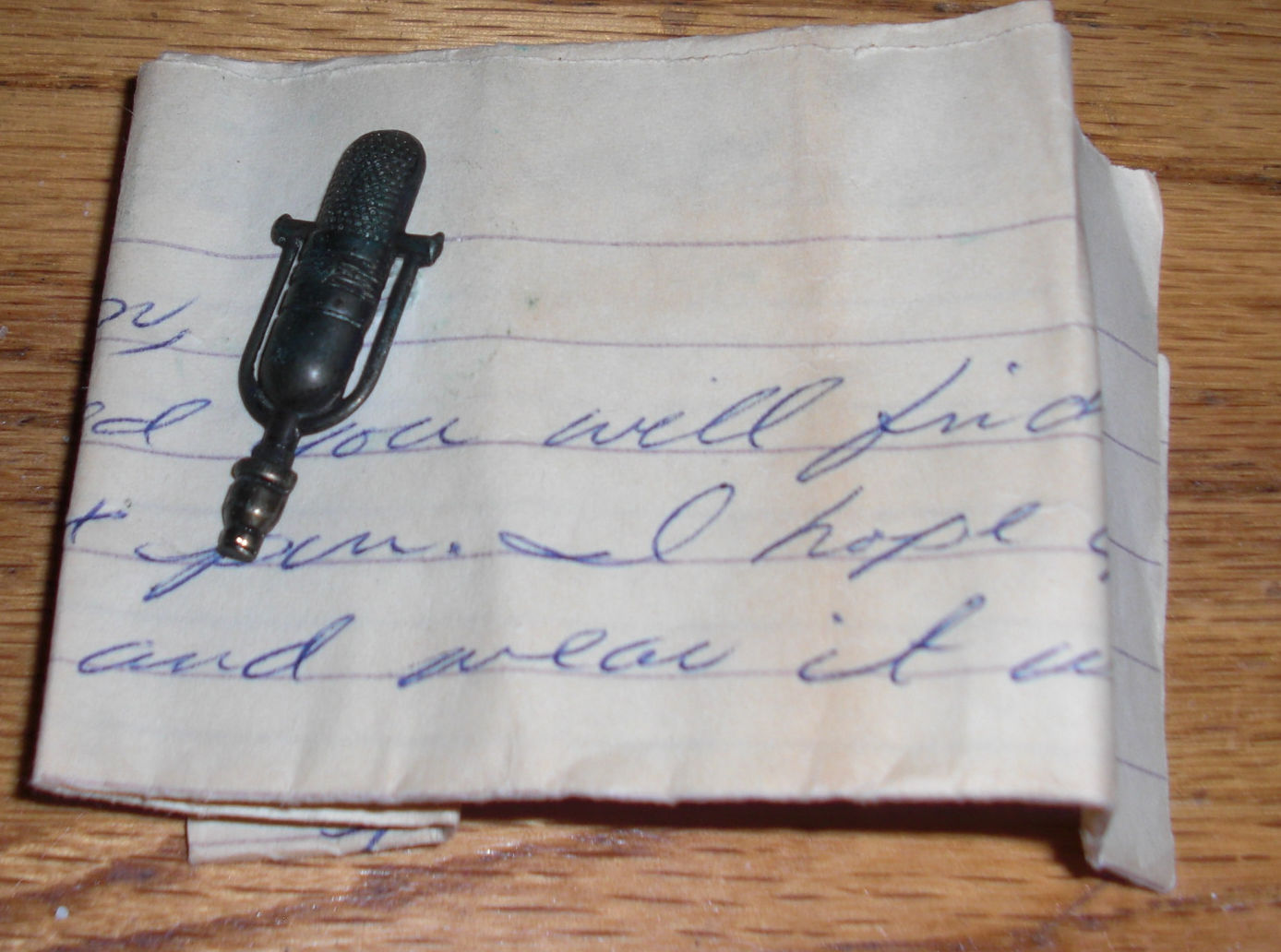 Tie tack with RCA 44 microphone design. RCA 77 microphone tie tack with explanatory letter from woman whose husband had owned the item explaining its provenance.