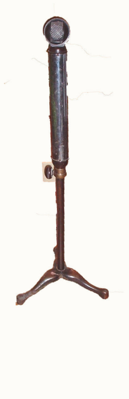 Remler condesnsor microphone on original stand. Remler microphone power supply (middle picture) required to operate the pre-amp inside the microphone's chrome cylinder and the optional associated Remler two-channel microphone mixer (right). The microphone came from KHQ, Spokane WA, 1931.