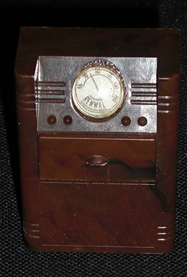 Renwal console radio, dollhouse furniture, c. 1950. Robbins tape cleaner for reel-to-reel tape recorder, c. 1970.