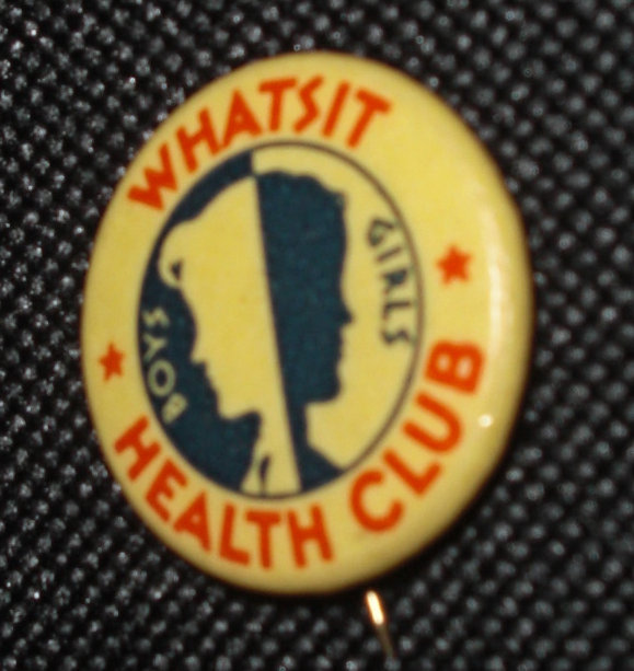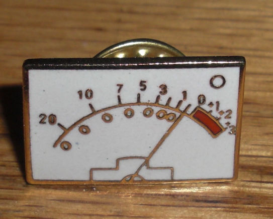 VU meter tie tack, modern. Whatsit Health Club pinback, c. 1935