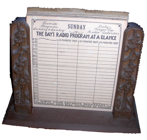 Radio at a Glance cards in holder to schedule listener's desired programs and stations