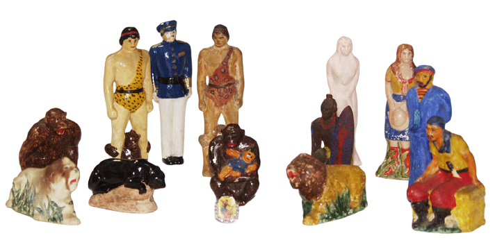 Tarzan radio program. Sponsor Foulds Pasta Products made these bisque figures available. They came unpainted and a paint kit to paint the figures was also offered. 1933
