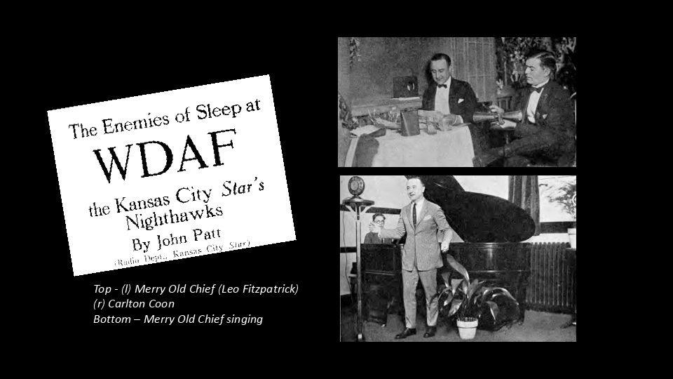 By late 1922 it was somewhat commonplace for a radio station to arrange to broadcast a band or orchestra which was appearing at a local hotel.  In December, 1922 the Coon-Sanders Orchestra as performing at one of Kanas City's finest hotels, the Muehlbach, and WDAF arranged to broadcast them beginning at 11:15 one evening.  The broadcast was being announced by Leo Fitzpatrick and legend has it that, not realizing that he was near a live mike, Fitzpatrck reportedly said "No one else would be listening this late at night other than bunch of Night Hawks."  Within minutes, telegraphs started arriving saying "I'm listening and enjoying your broadcast so I guess I'm a Night Hawk."  Realizing a good thing when it hit them, the Coon Sanders group promptly renamed itself the Nighthawk Orchestra and WDAF promptly began offering membership cards for the Nighthawk Club to anyone asked for one.