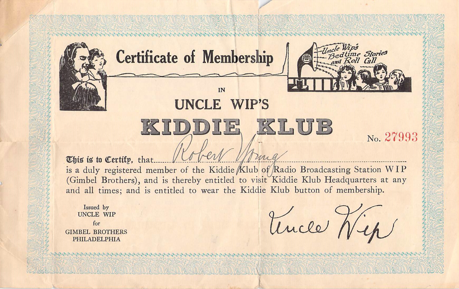 WIP, owned by Gimbels Dept. store, signed on in 1923 and within weeks of it inauguration the "Uncle WIP" program, reading stories to children, was a huge favorite. Uncle WIP remained a figure on the station for decades.